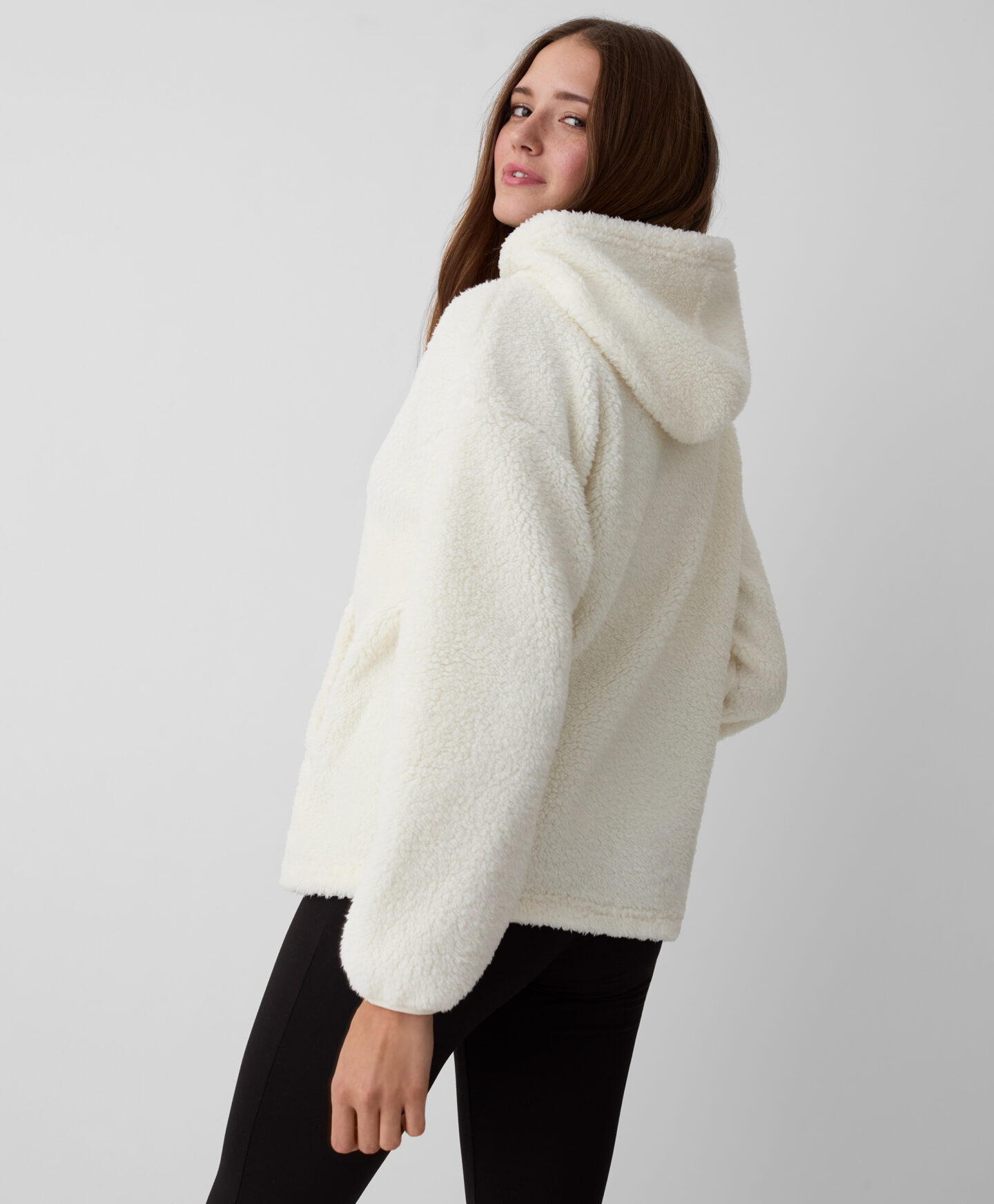 Bluza damska sherpa biała z kapturem to obowiązkowy element garderoby w sezonie jesienno-zimowym. Przyjemny w dotyku materiał zapewnia ciepło i komfort noszenia. Praktyczny kaptur chroni przed wiatrem i zimnem, a kieszeń typu kangurka ogrzewa zmarznięte dłonie. Idealna na chłodne dni.
