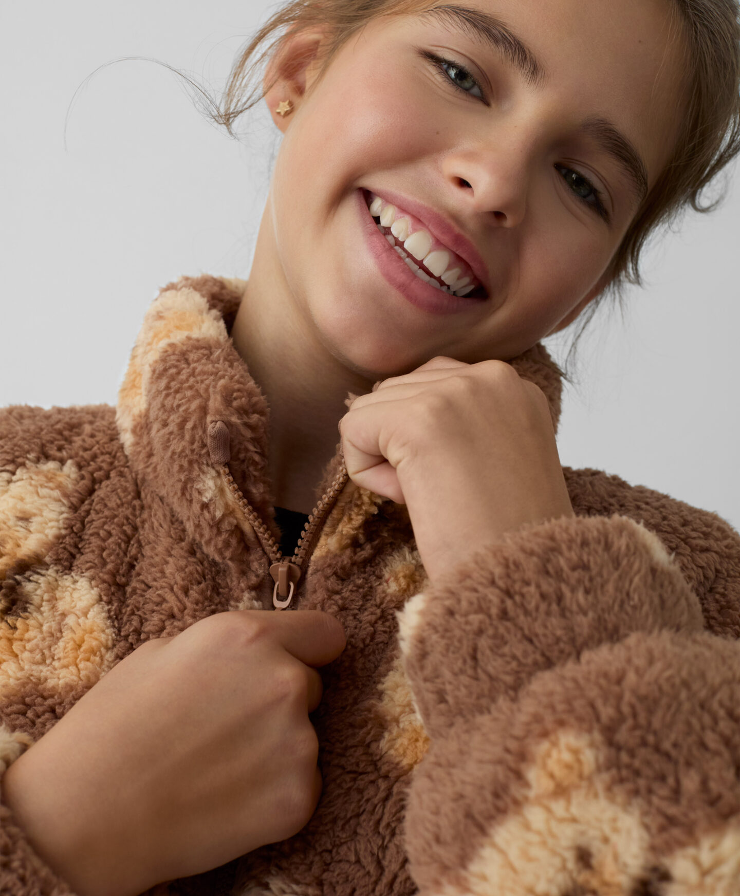 Bluza dziewczęca sherpa w misie jest zapinana na wygodny suwak. To połączenie dobrego stylu, ciepła i komfortu. Wykonana z miłego w dotyku materiału, delikatnie otula skórę dziecka. Zapięcie na suwak na całej długości gwarantuje szybkie zakładanie i zdejmowanie, a luźny krój nie krępuje ruchów, zapewniając dziecku pełną swobodę.