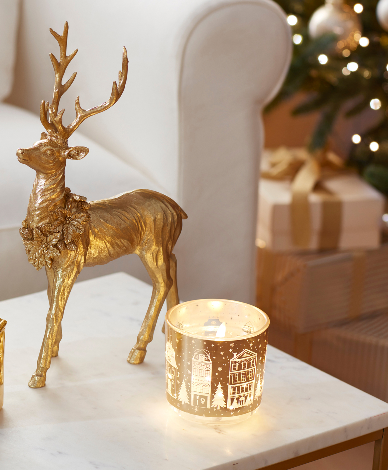 Jeleń z wieńcem i złotymi akcentami to klasyczna figurka w nowoczesnym wydaniu. Lśniące zdobienia podkreślają każdy detal, a elegancki wieniec dodaje mu odświętnego charakteru. To dekoracja, która wprowadza do wnętrza majestatyczny urok zimowych opowieści, stając się jednym z głównych punktów bożonarodzeniowych aranżacji.