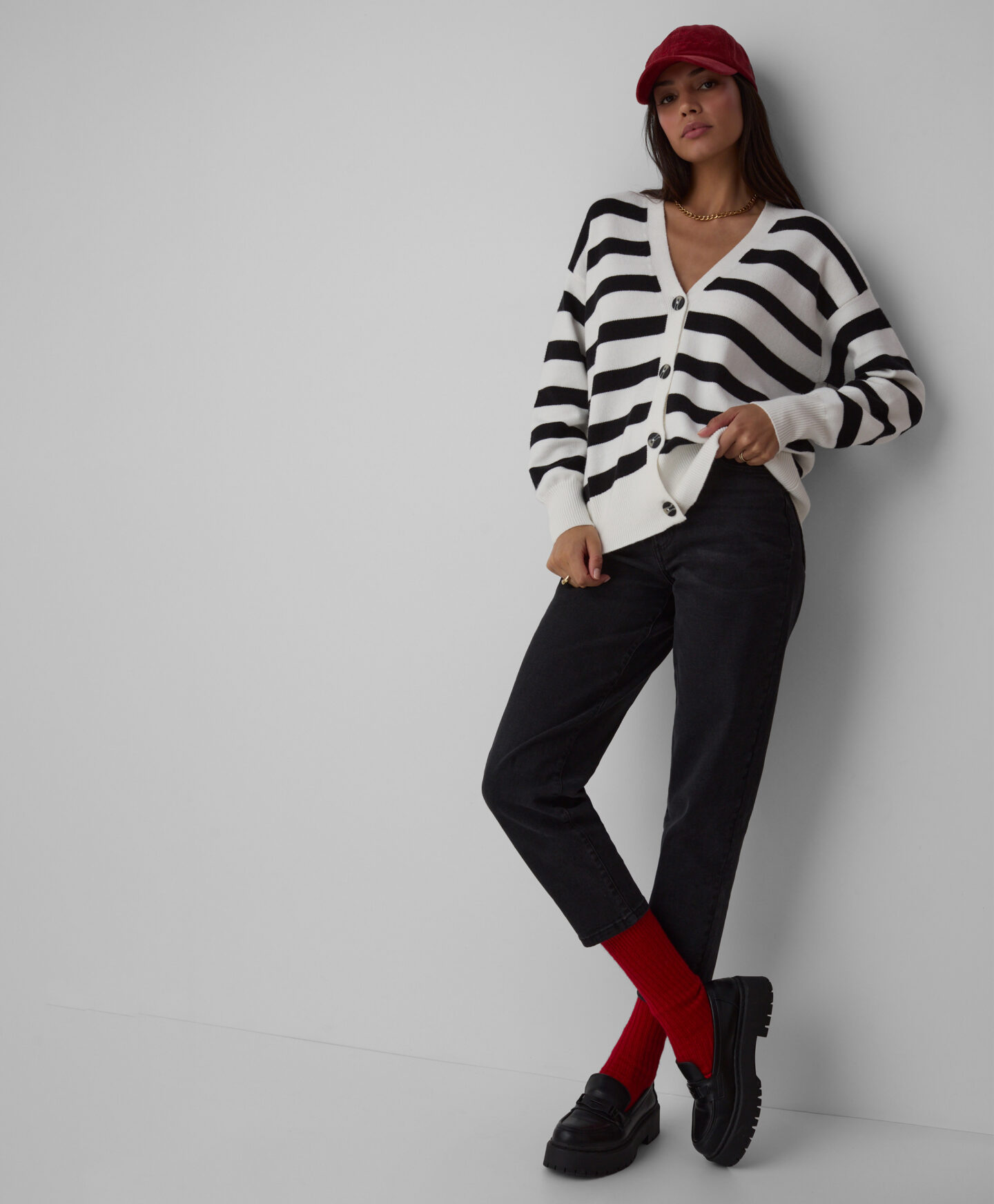 Kardigan damski w czarno-białe pasy, o szerokim kroju, to coś dla miłośniczek klasyki w wygodnym wydaniu. Wzór w paski nigdy nie wychodzi z mody i świetnie prezentuje się zarówno z eleganckimi spodniami, jak i klasycznymi jeansami. Miękki materiał z wiskozą miło otula skórę i oferuje ciepło w chłodne zimowe dni. W ofercie dwa warianty kolorystyczne.