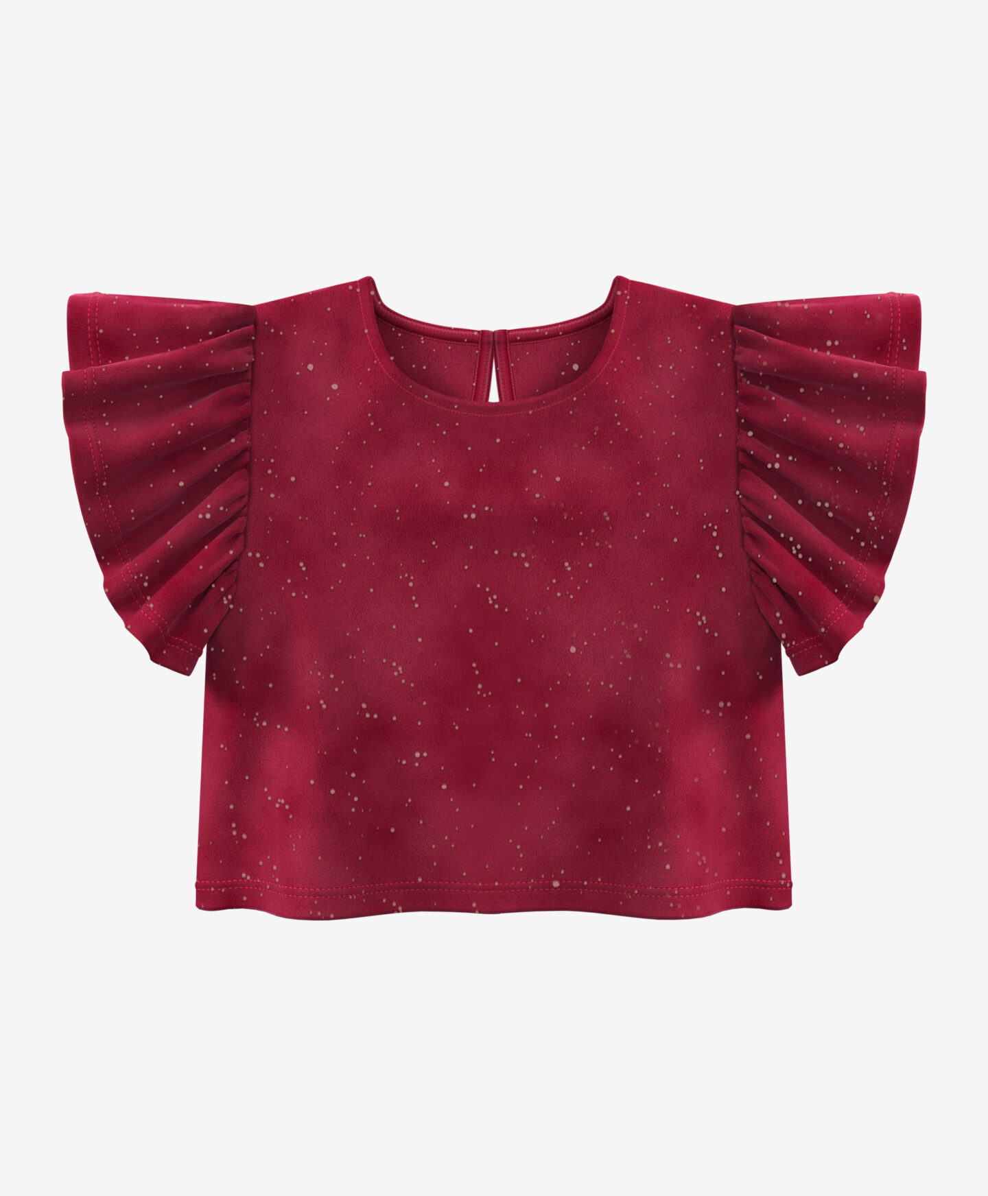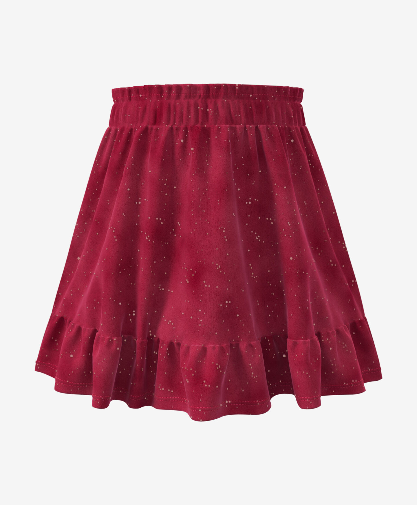 Komplet dziewczęcy: bluzka i spódniczka to idealny zestaw dla młodej damy. Komplet wykonany jest z weluru. Rękawki w formie falbanek i falbanka przy spódnicy dodają kompletowi lekkości. Bluzka i spódnica idealnie się komponują, tworząc spójną stylizację.