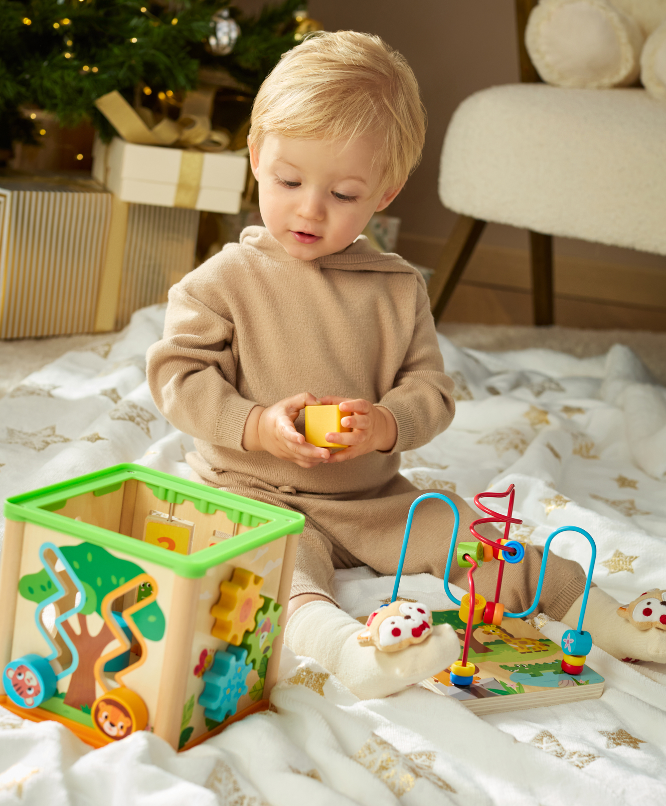 Kostka edukacyjna to drewniana zabawka z wieloma aktywnościami na każdej ściance. Dziecko może przesuwać klocki, dopasowywać kształty i obracać elementy, co rozwija zręczność i logiczne myślenie. Różnorodność funkcji sprawia, że zabawa jest angażująca i trwa długo.