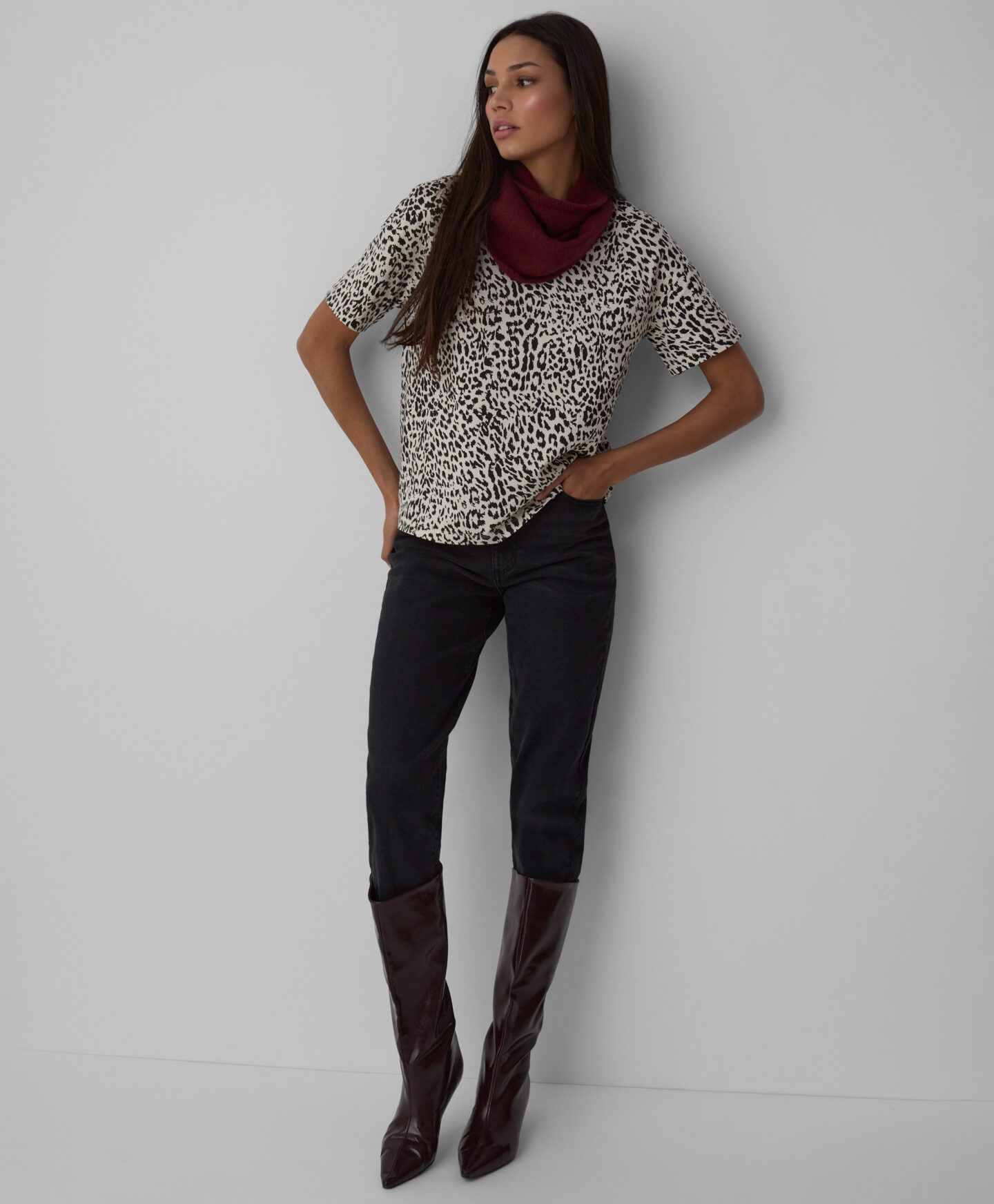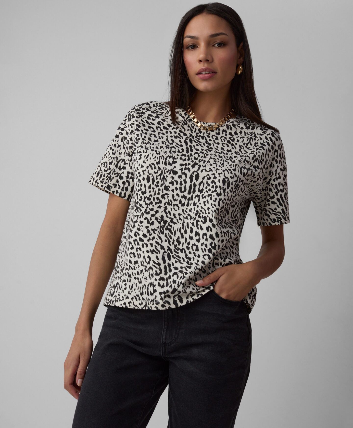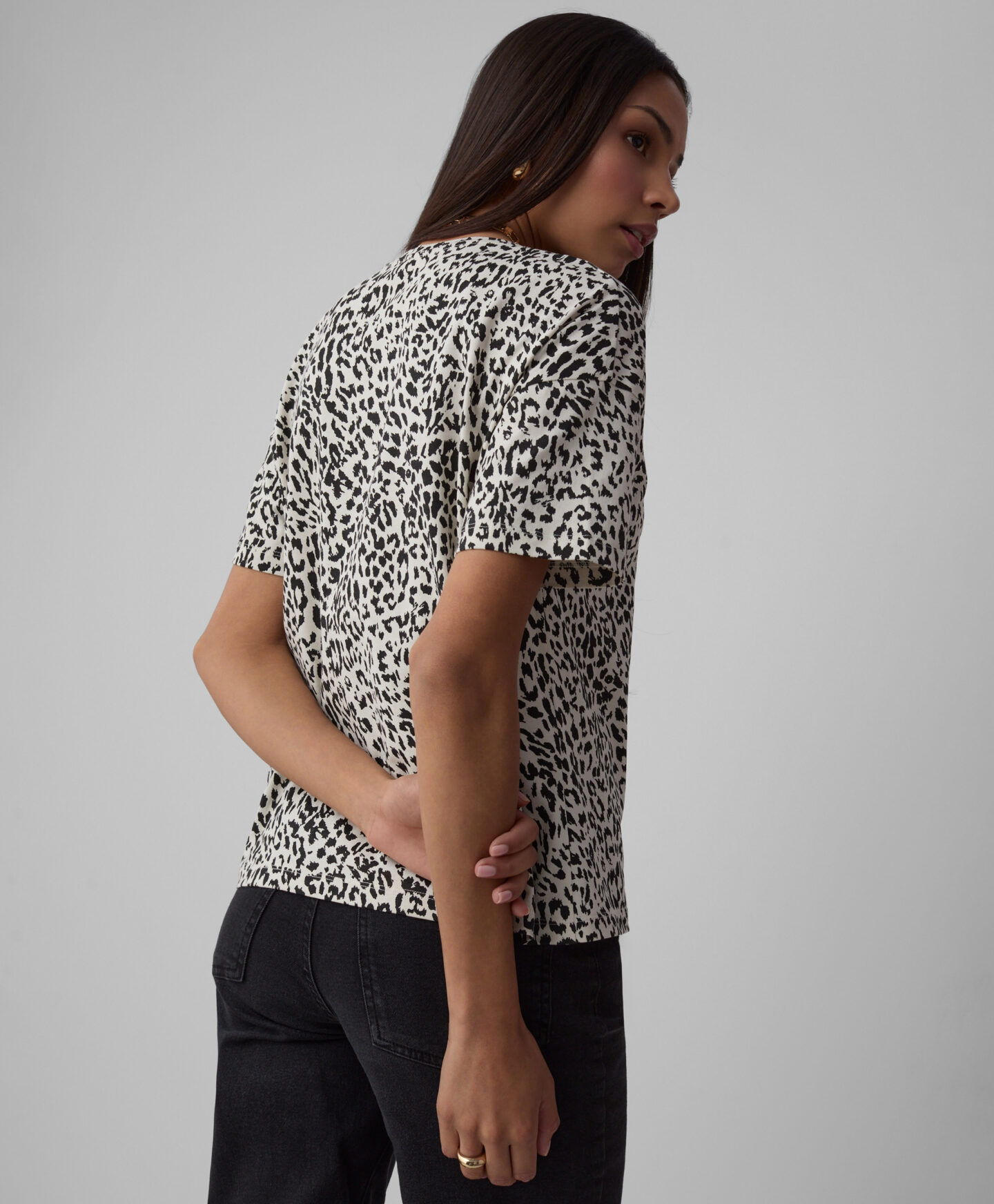 Koszulka damska 100% bawełny, w cętki, jest miękka, przewiewna i przyjazna dla skóry. Naturalny materiał zapewnia wygodę przez cały dzień noszenia i świetnie sprawdza się przez cały rok. Idealna do założenia pod kardigan, żakiet czy bluzę w chłodniejszym okresie.