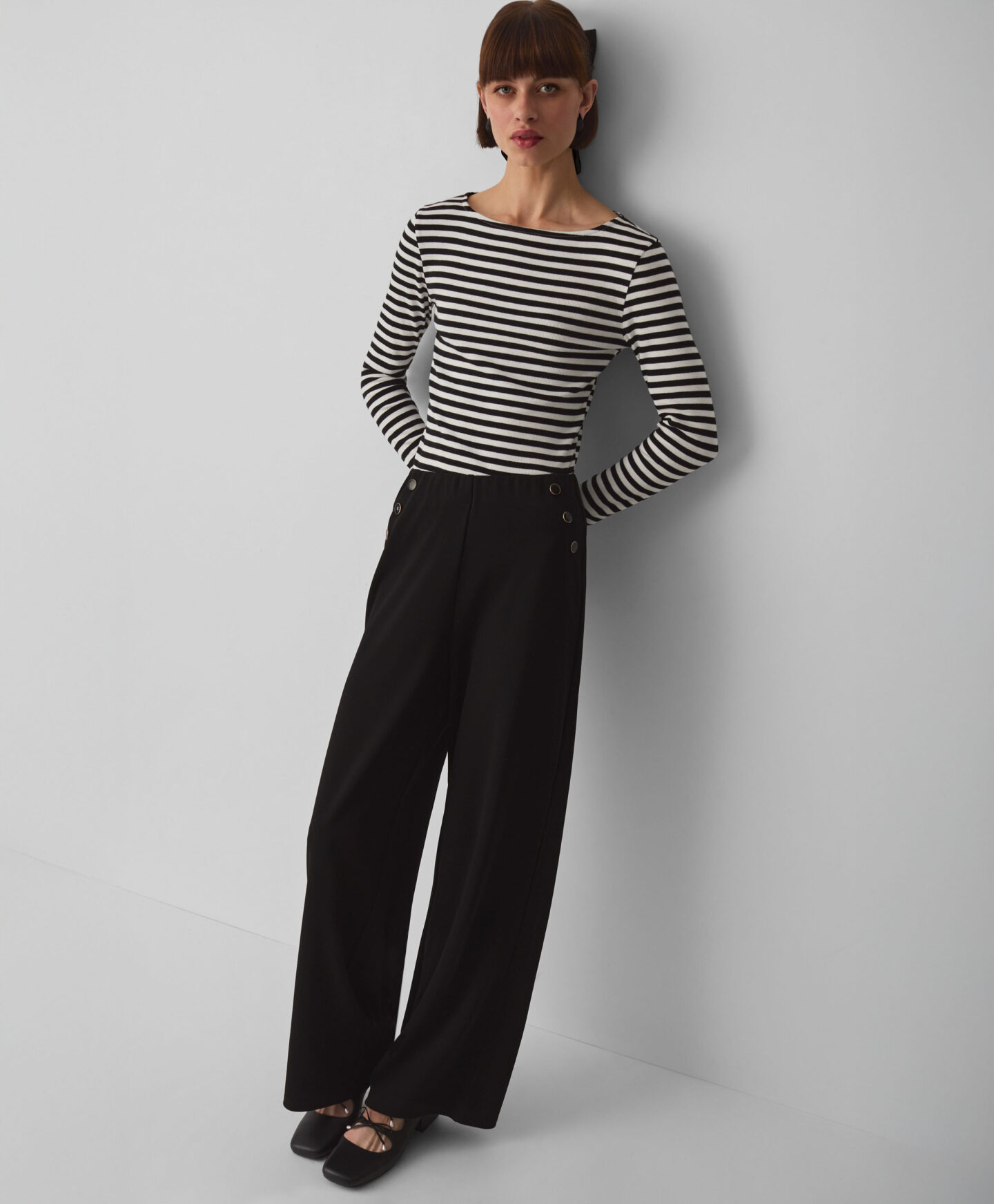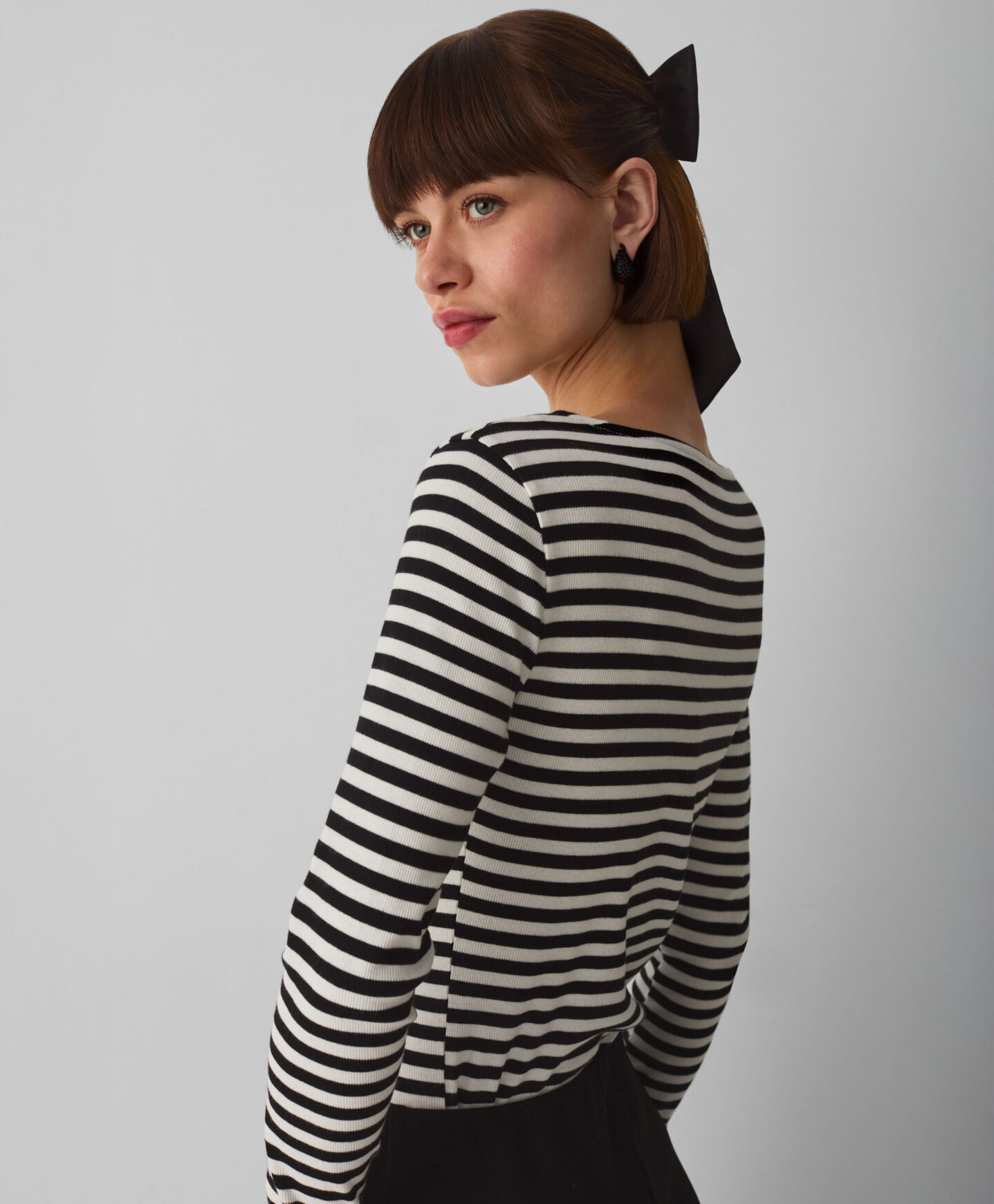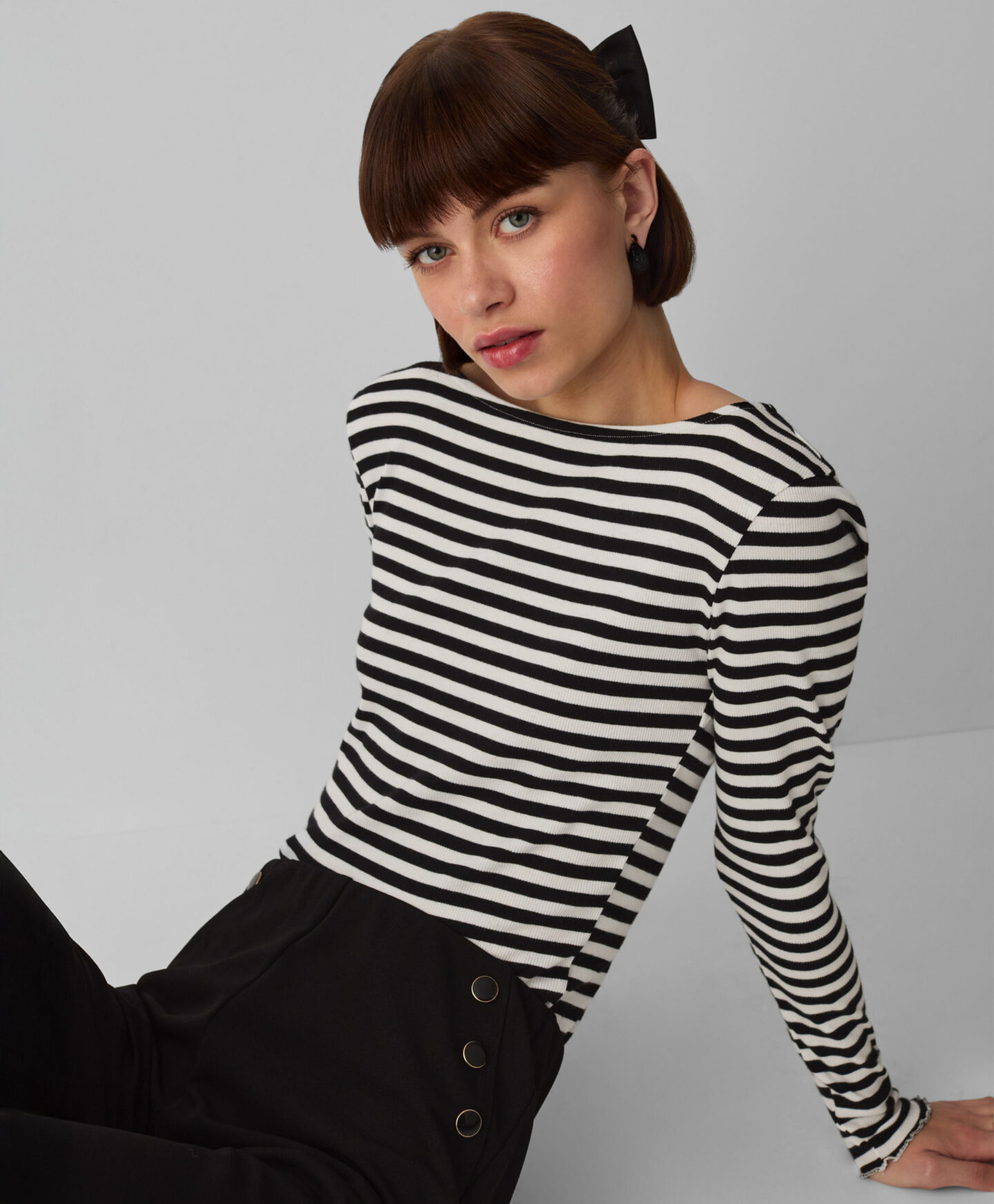 Koszulka damska w paski z wysoką zawartością bawełny świetnie prezentuje się zestawiona z klasycznymi jeansami. Jest lekka, miła w dotyku i oddychająca. Będzie doskonałym wyborem zarówno do pracy, jak i podczas relaksu w domowym zaciszu. W ofercie znajdziesz więcej wariantów kolorystycznych koszulek w paski.