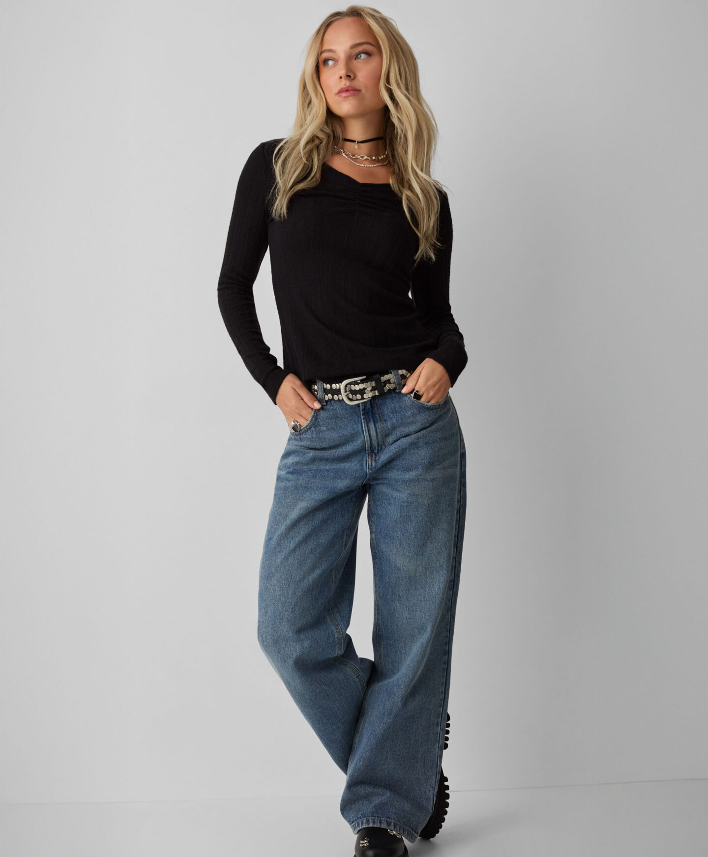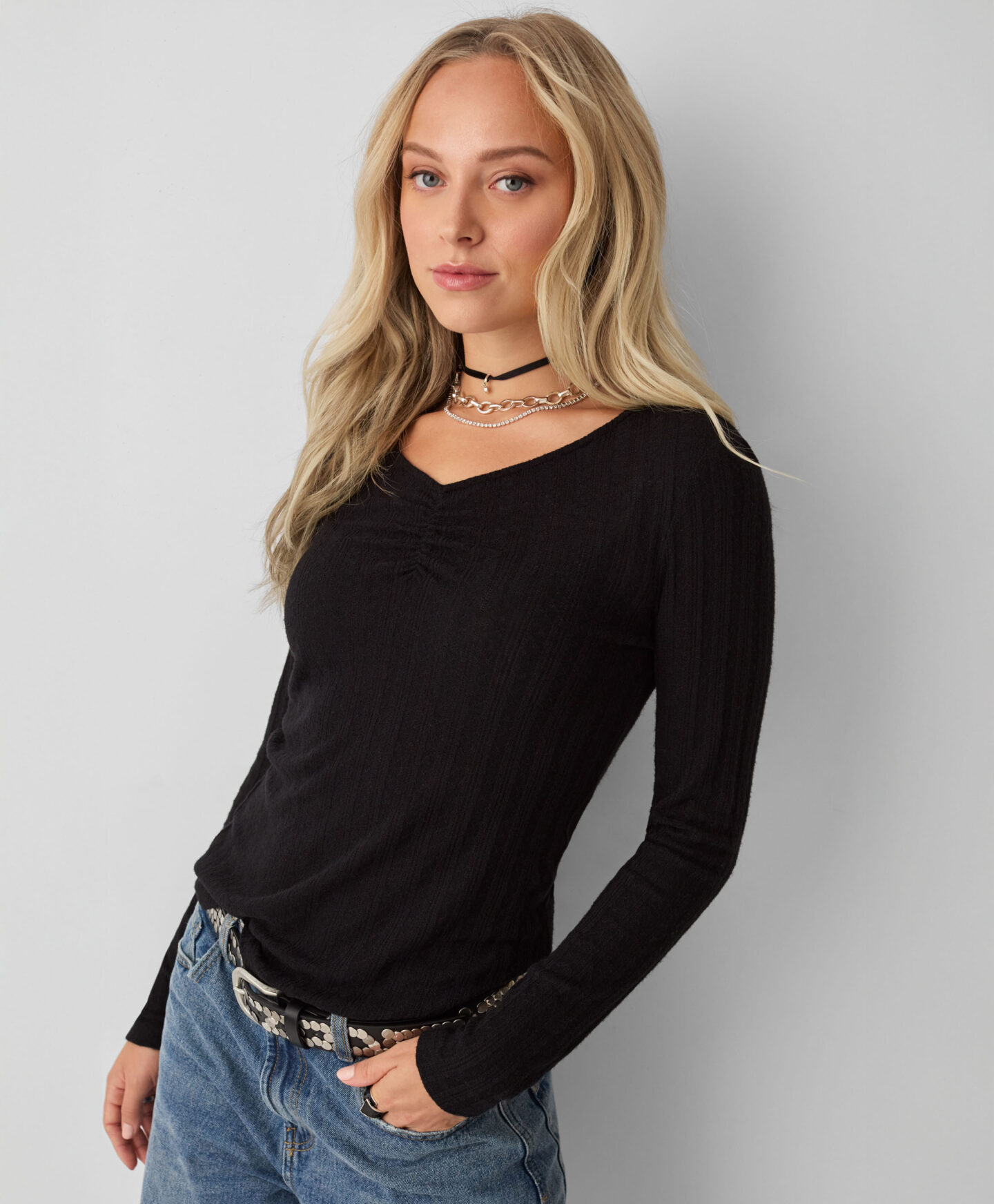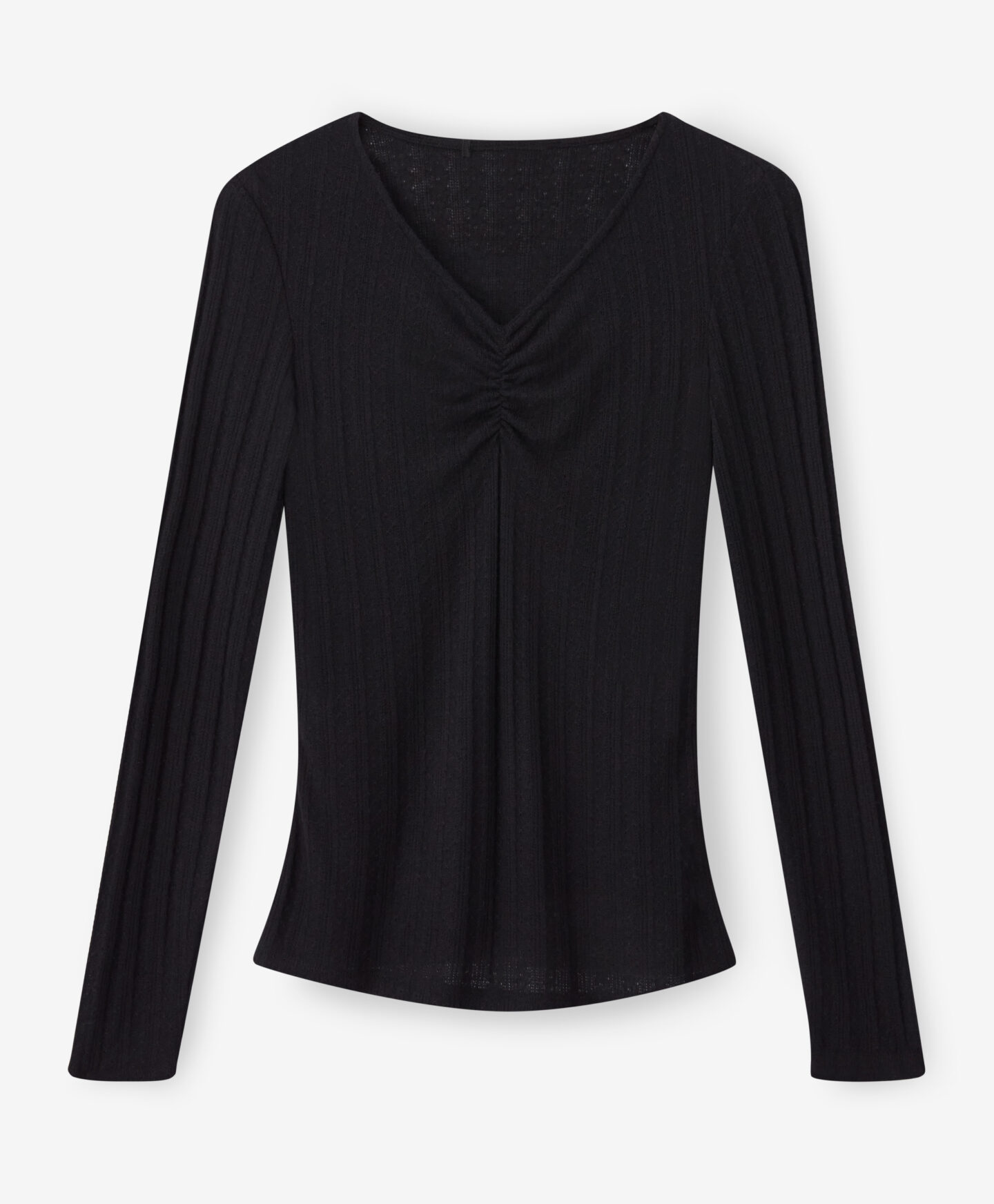 Koszulka damska z marszczeniem i długim rękawem to coś dla miłośniczek klasyki. Świetnie sprawdzi się pod luźniejszą marynarkę lub sweter w chłodne dni, oferując dodatkową warstwę ciepła. Marszczenie przy dekolcie to kobiecy akcent, podkreślający atuty sylwetki. Czarny kolor sprawia, że koszulka pasuje praktycznie do wszystkiego.