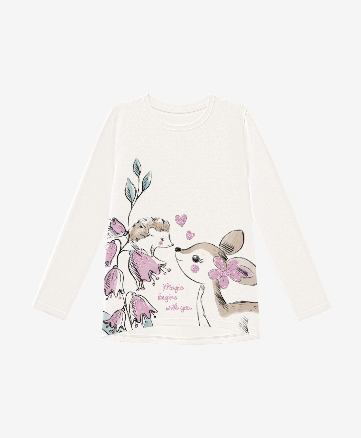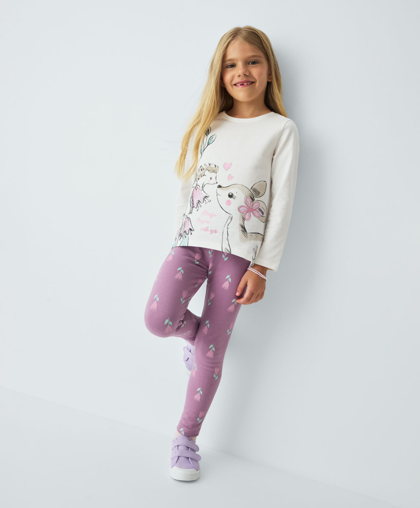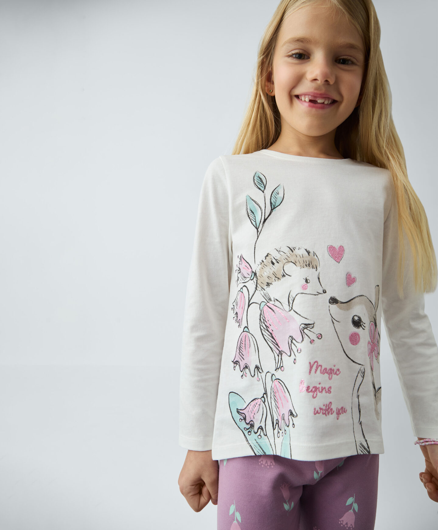 Koszulka dziewczęca 100% bawełny ma długi rękaw i piękny wzór na froncie. Doskonale pasuje do legginsów z oferty. Sprawdzi się do przedszkola, szkoły lub w czasie wolnym. Miękki materiał miło otula skórę, gwarantując dziecku ciepło w pierwsze jesienne chłody. Stonowany kolor będzie bazą wielu udanych stylizacji.