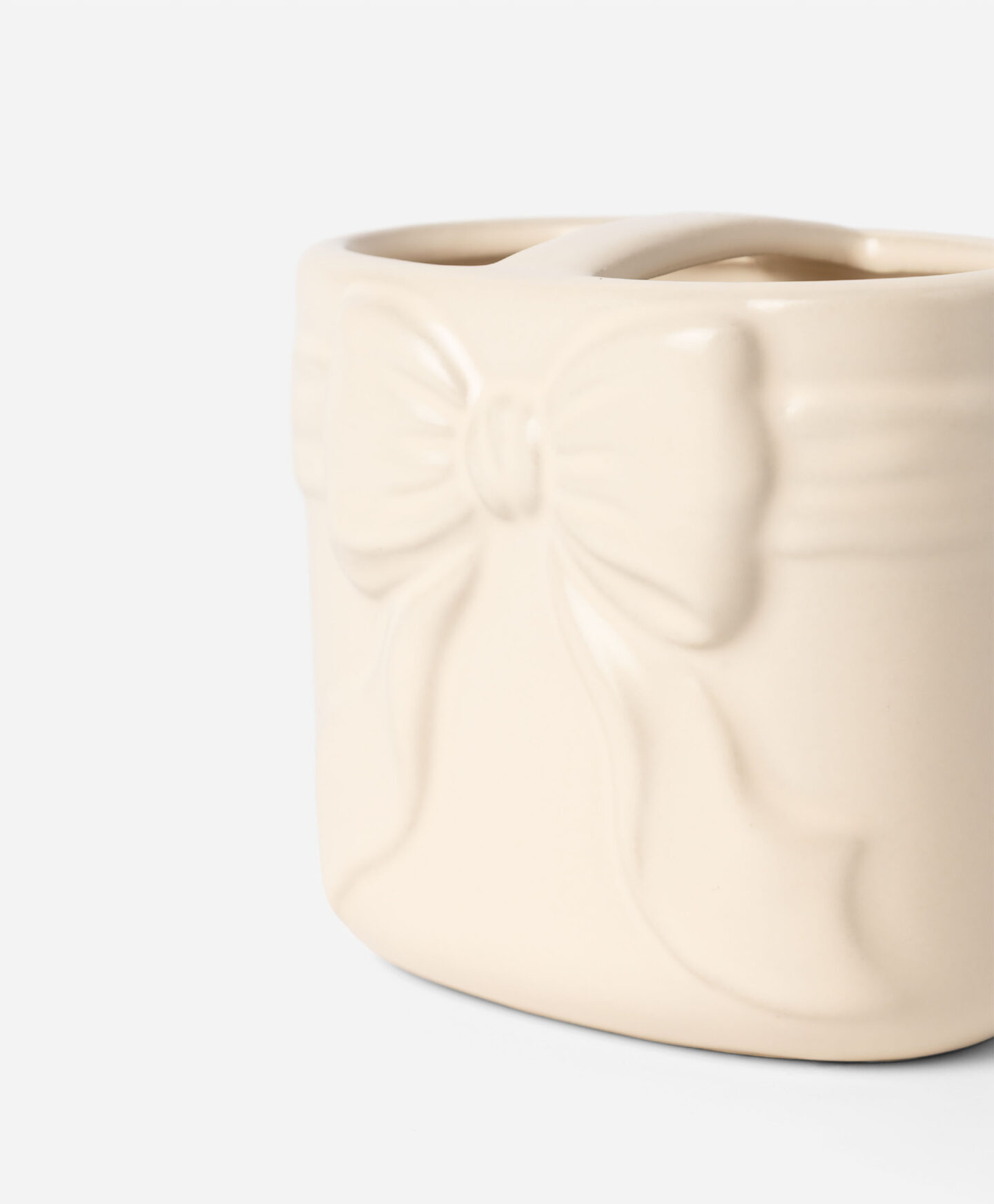 Kubek ceramiczny na szczoteczki, z kokardą, ma dwie pojemne komory oraz estetyczne wykończenie. Motyw kokardki idealnie pasuje do innych akcesoriów łazienkowych z kolekcji. Kubek wykonany z kamionki jest trwały, odporny na codzienne użytkowanie oraz łatwy do utrzymania w czystości.