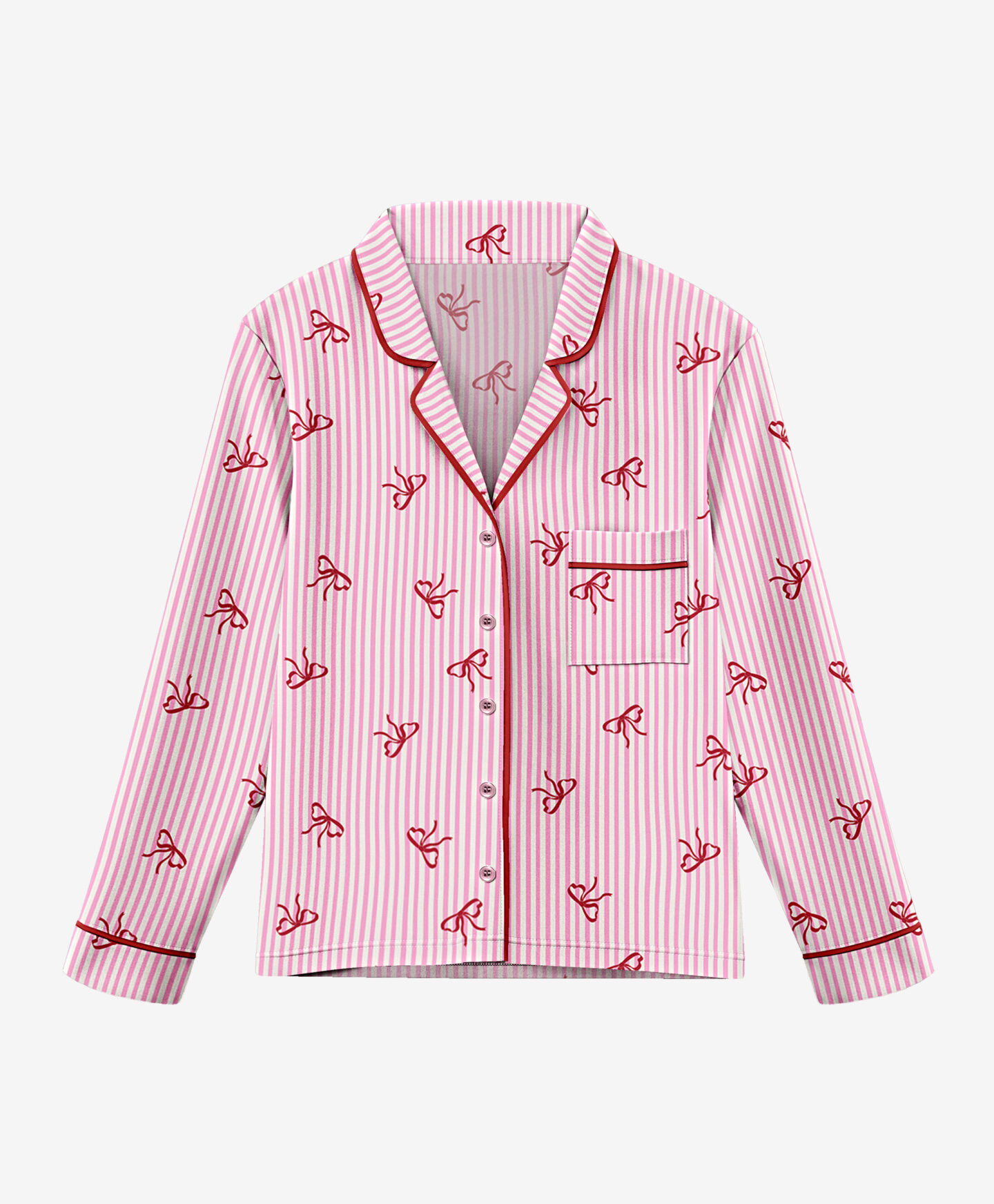 Piżama damska w kokardy składa się ze spodni i koszuli z kołnierzykiem, zapinanej na urocze różowe guziki. Piżama jest delikatna w dotyku i ciepła, idealna na chłodniejsze noce lub wieczorny relaks z książką w dłoni. Ta piżama to także świetny pomysł na prezent.
