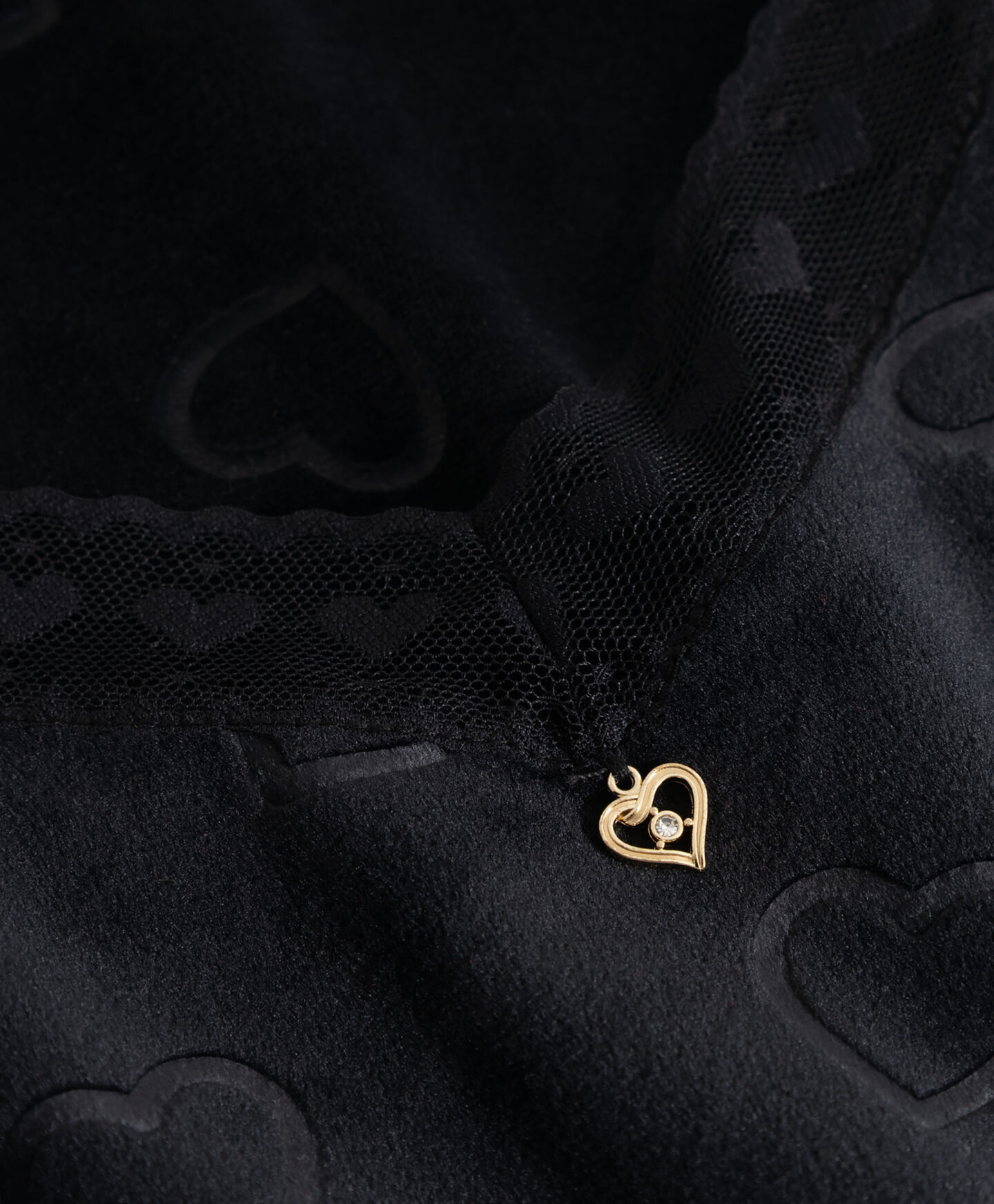 Piżama damska welurowa czarna z koronką i wytłoczeniem w kształcie serc to romantyczna propozycja na nadchodzące walentynki. Zestaw składa się z koszulki na cienkich ramiączkach oraz szortów, które świetnie leżą na sylwetce, podkreślając jej atuty. W ofercie dostępne dwa warianty kolorystyczne.