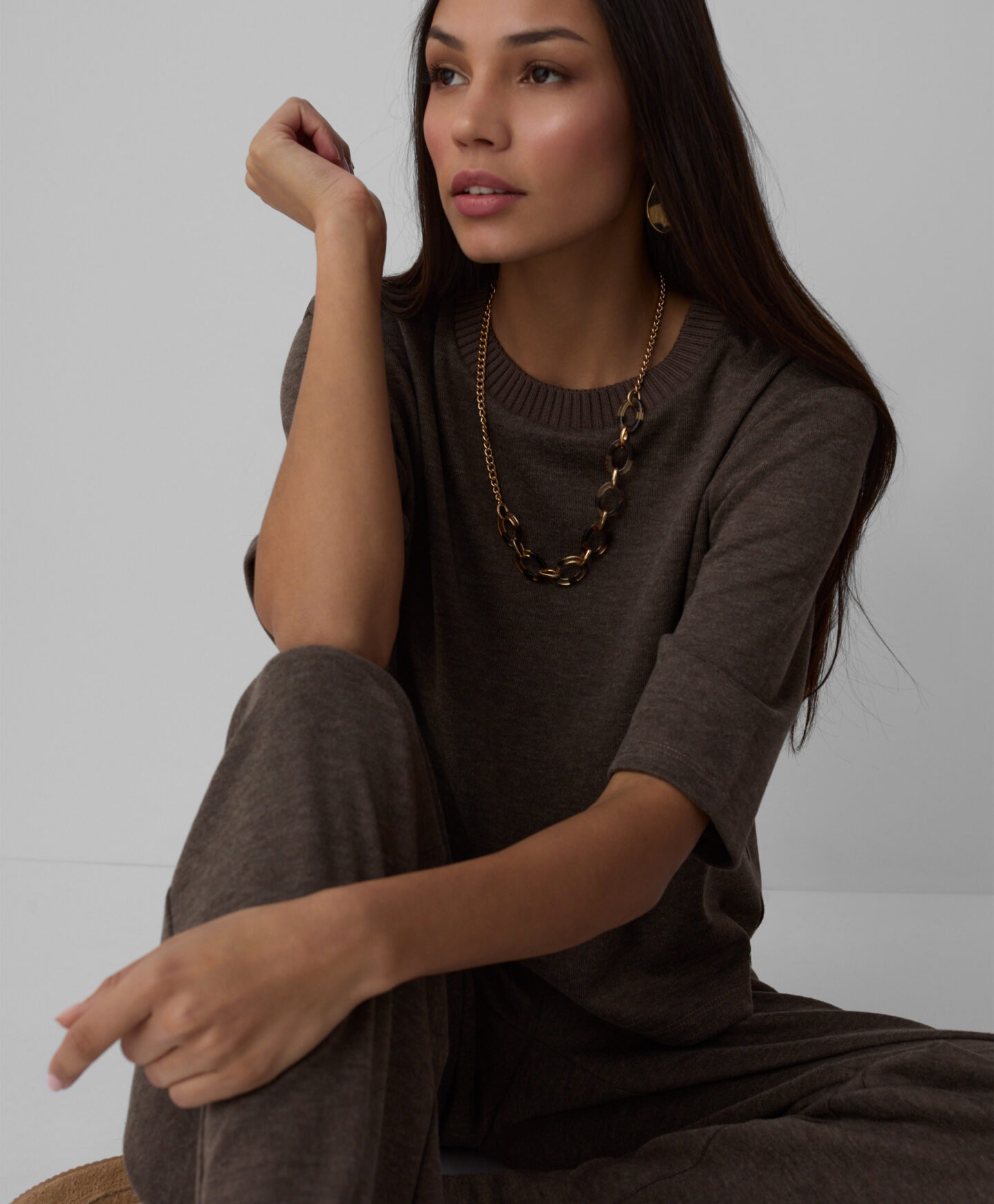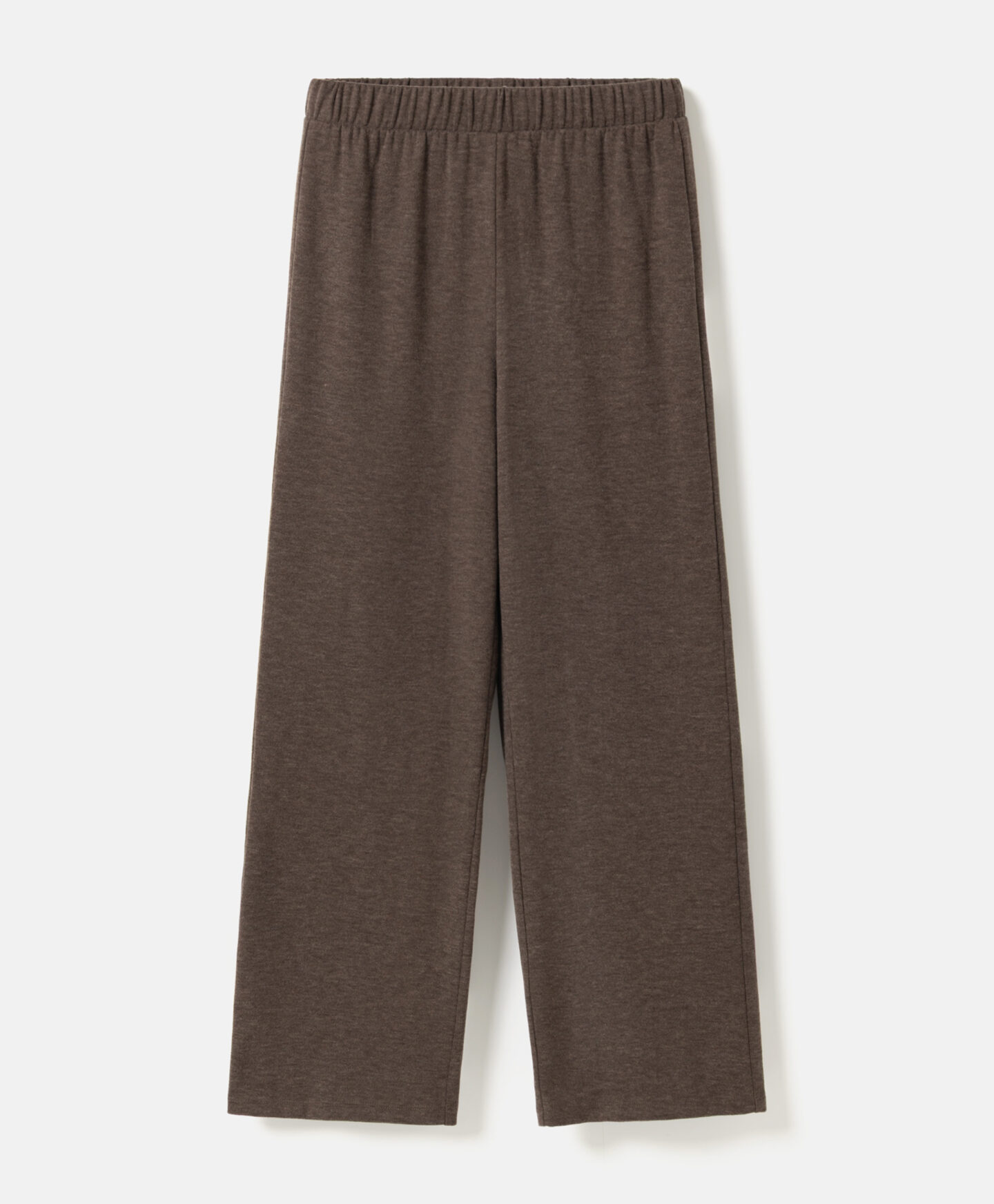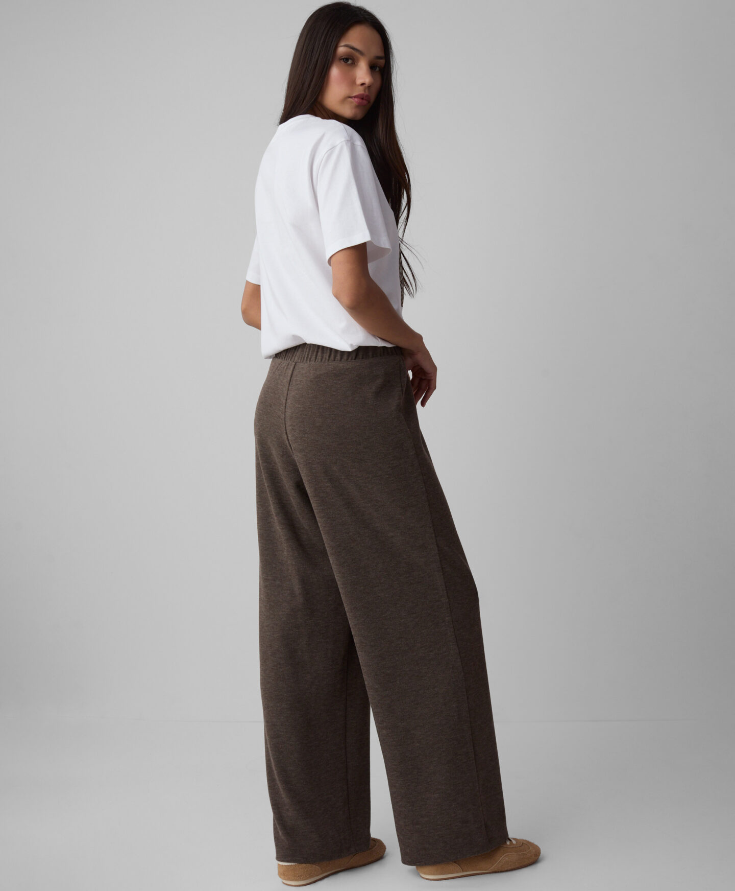 Spodnie damskie brązowe, z szerokimi nogawkami, doskonale pasują do koszulki z kolekcji w tym samym kolorze. Są miękkie i miłe w dotyku. Modna szerokość nogawki oferuje wygodę noszenia i sprawia, że świetnie sprawdzą się zarówno na wyjście ze znajomymi, jak i podczas relaksu w domowym zaciszu.