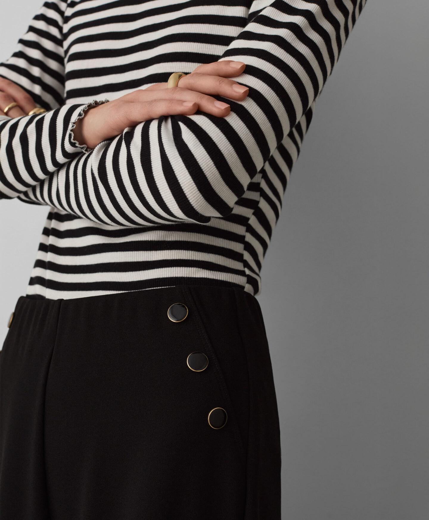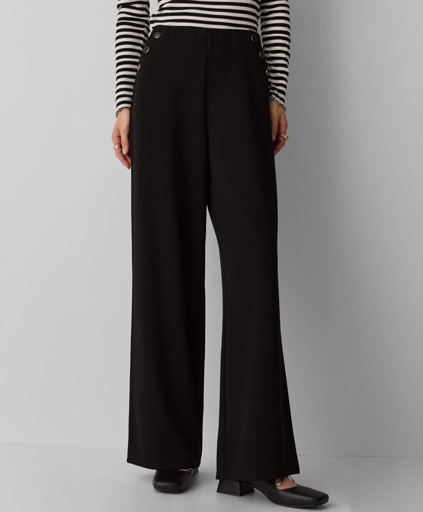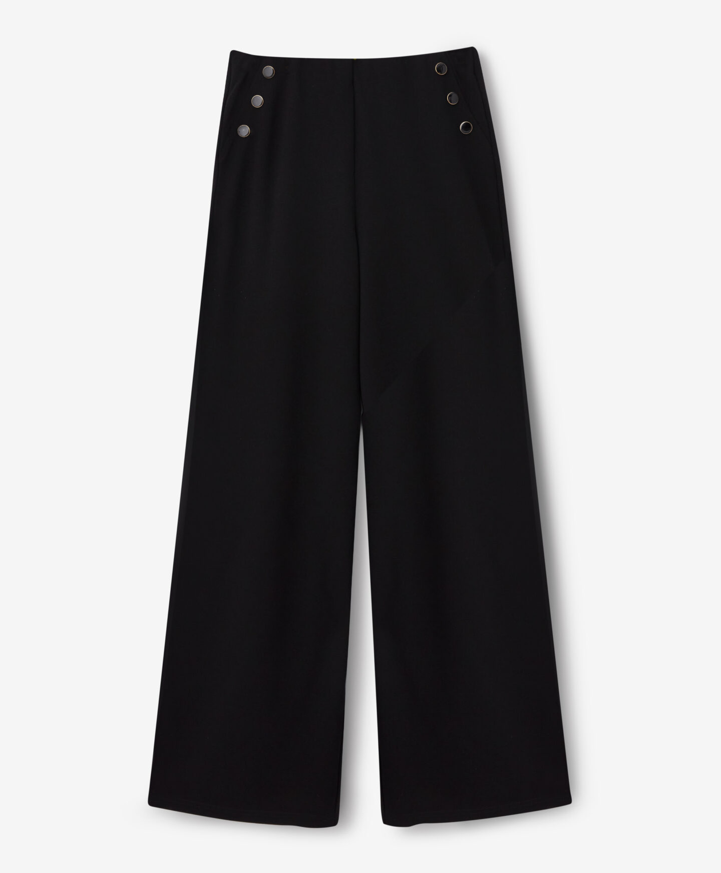 Spodnie damskie z guzikami i szeroką nogawką pozwolą Ci zadać szyku w biurze i na bardziej uroczystych spotkaniach. Są wygodne, lekkie i przyjemne w noszeniu. Ozdobne guziki przykuwają wzrok, będąc modnym akcentem każdej stylizacji. Szerokie nogawki oferują swobodę każdego ruchu.