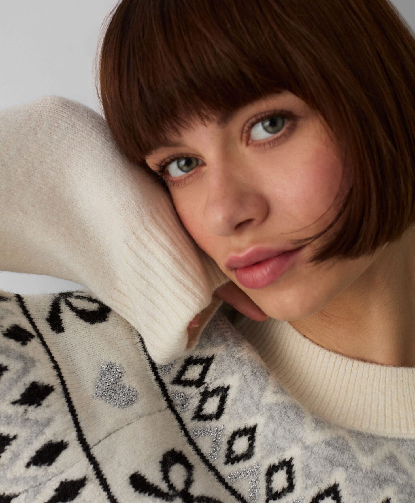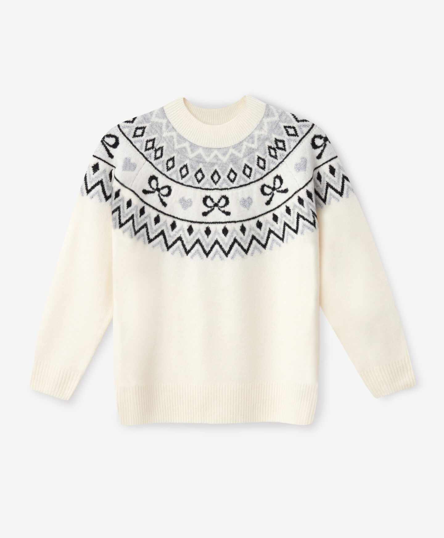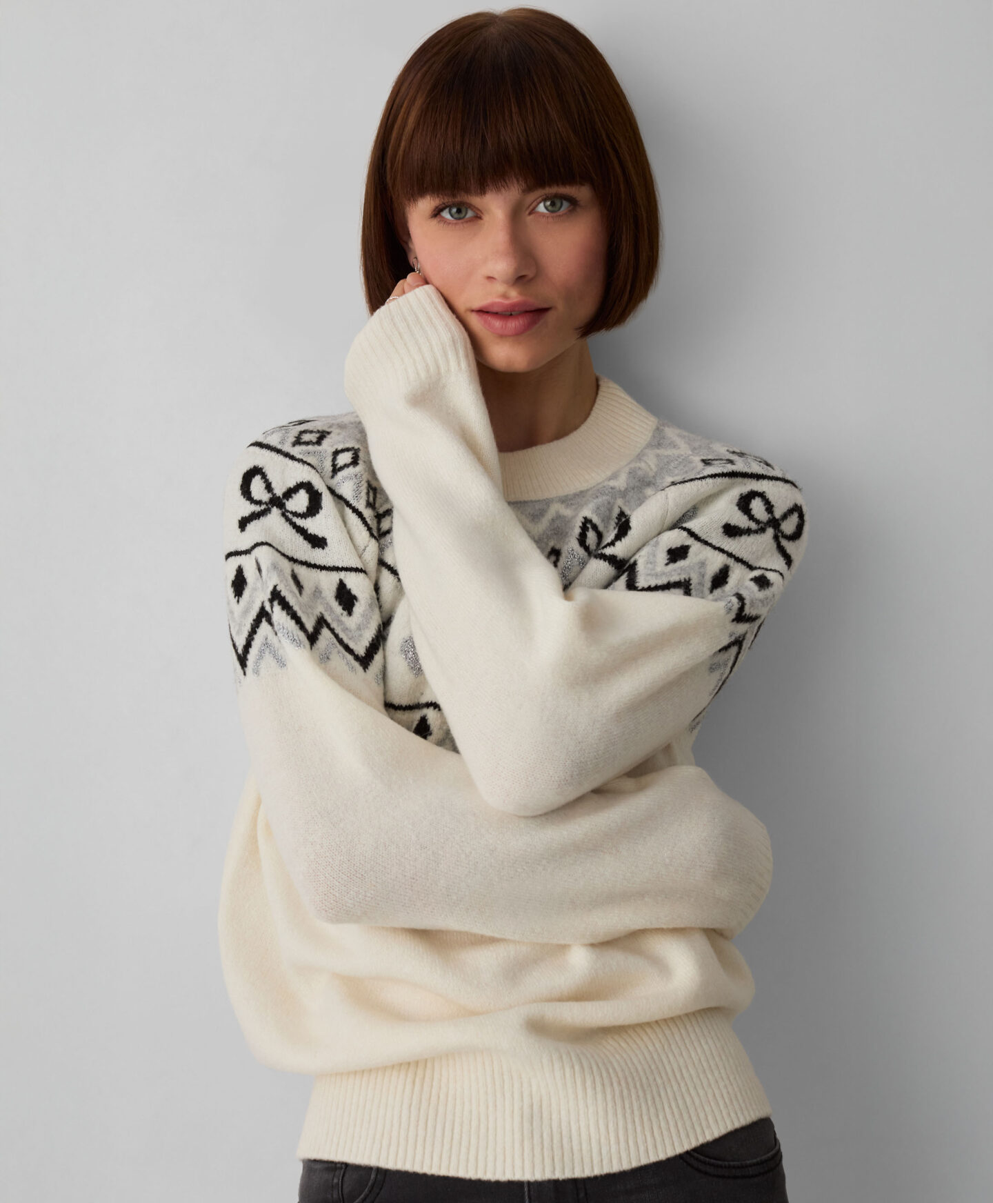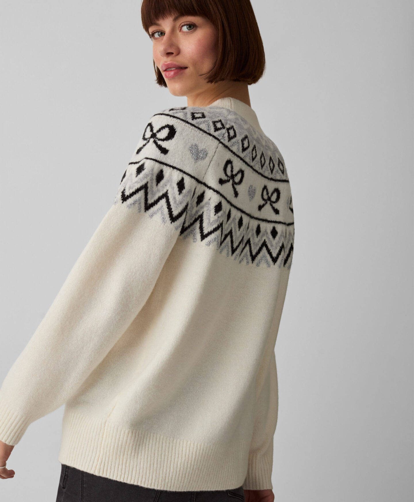 Sweter damski nordycki w kokardy jest nie tylko ciepły, ale też stylowy. Kremowy kolor przełamany szarością oraz czernią norweskich wzorów prezentuje się bardzo efektownie. Możesz połączyć go zarówno ze spódnicą, jak i spodniami, za każdym razem mają pewność udanej stylizacji.