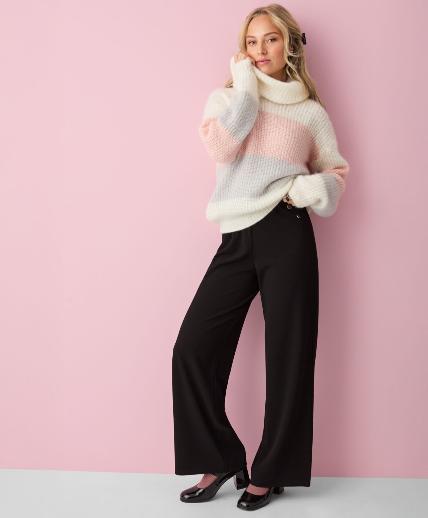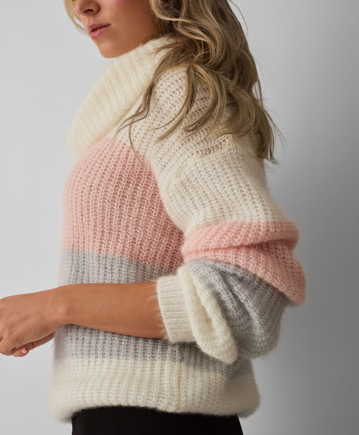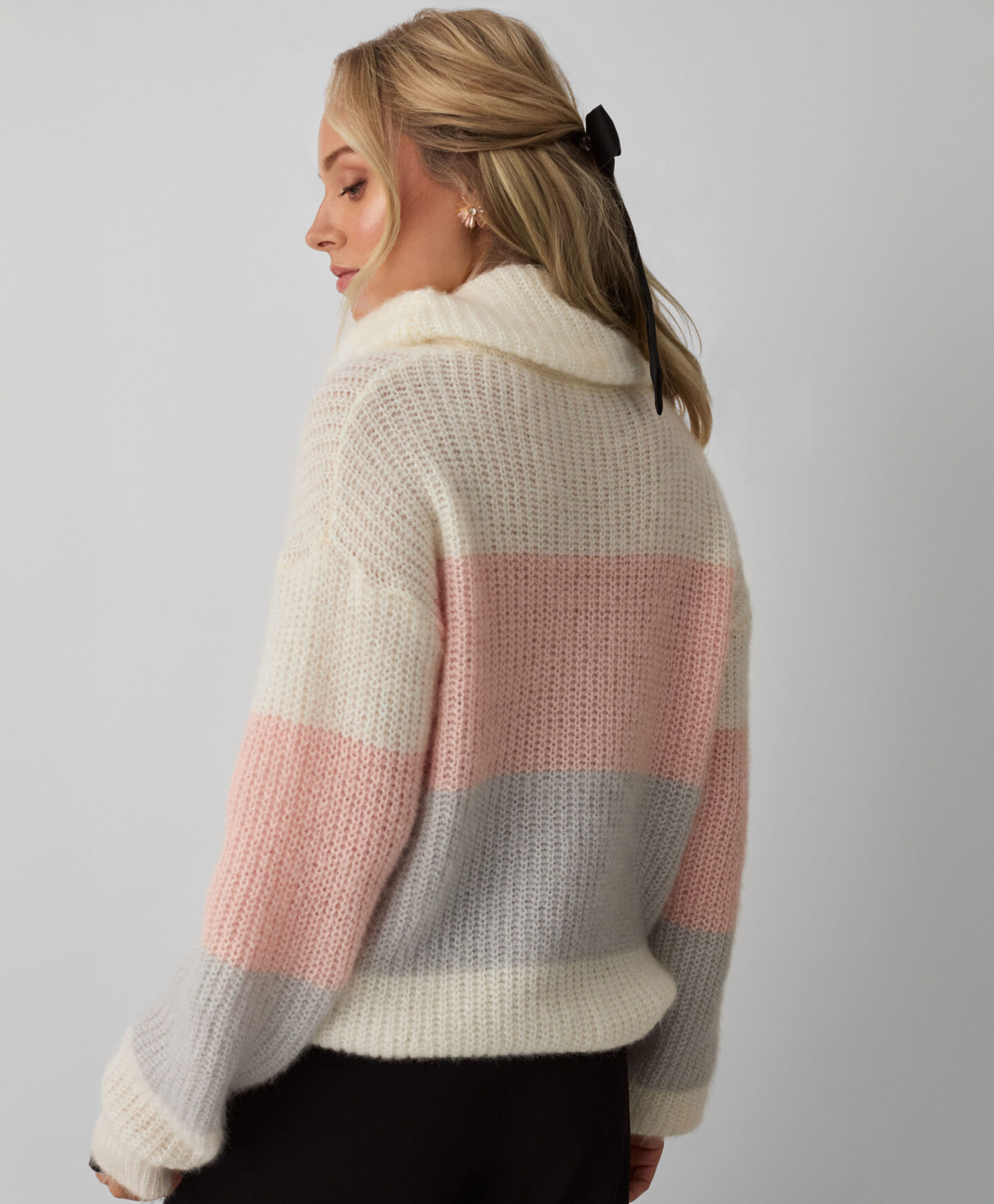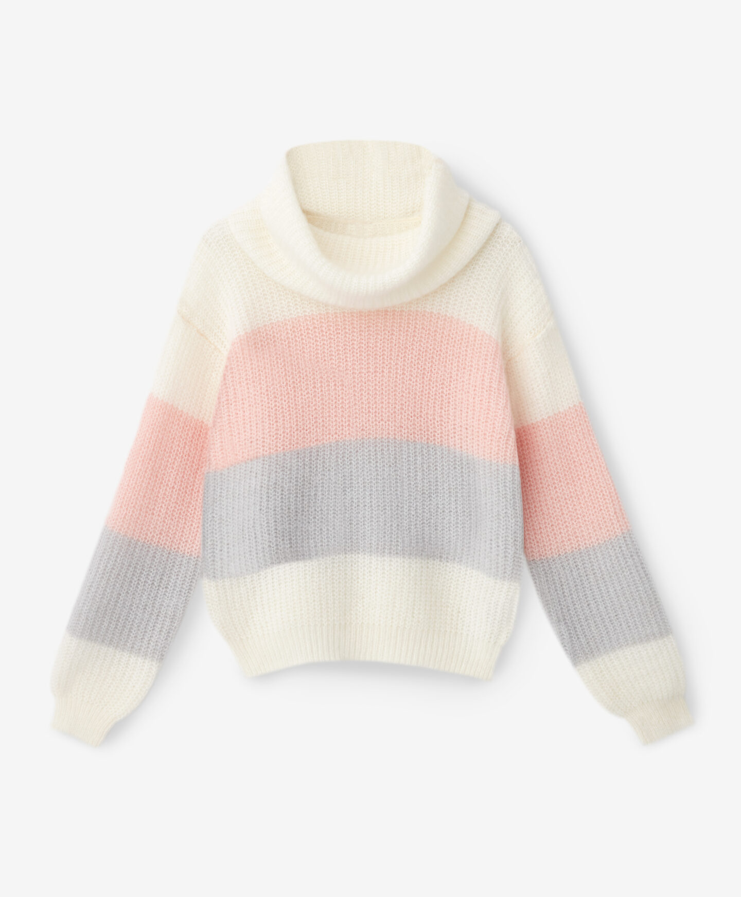 Sweter damski w pasy z obfitym golfem ogrzeje Cię w chłodne dni. Jest ciepły, miły w dotyku i wygodny w noszeniu. Szerokie pasy w pastelowych kolorach dodają mu delikatności. Świetnie będzie się prezentował w połączeniu z klasycznymi jeansami, spodniami zarówno eleganckimi, jak i tymi bardziej sportowymi.