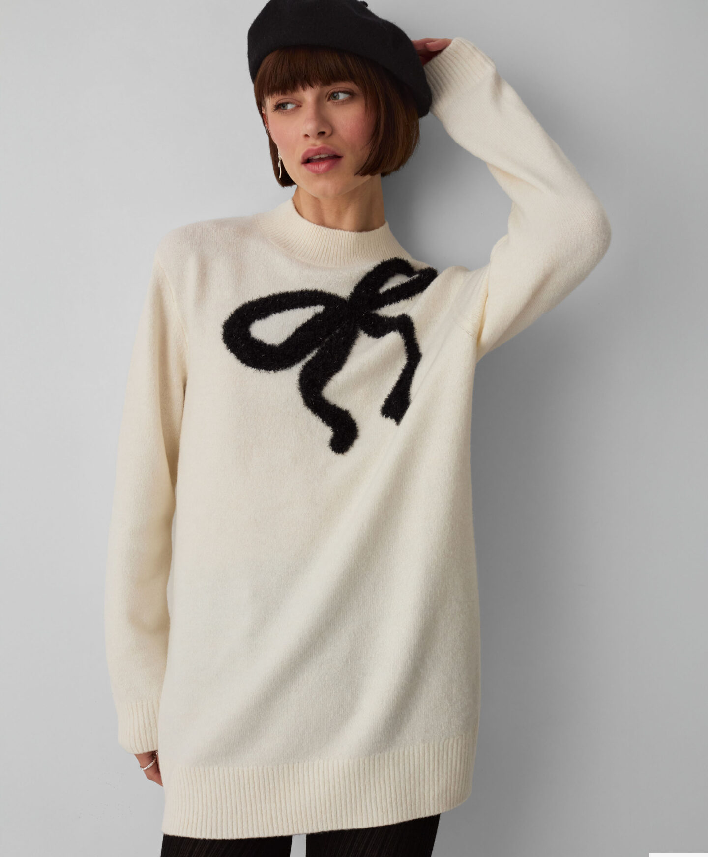 Tunika damska z kokardą z lureksem doskonale uzupełni Twoją jesienną garderobę. Jest długa, ciepła i stylowa. Świetnie będzie się prezentowała z legginsami lub grubszymi rajstopami. Uzupełniona o kozaki lub botki, stworzy strój doskonały na spacery, do biura lub spotkania ze znajomymi w czasie wolnym.
