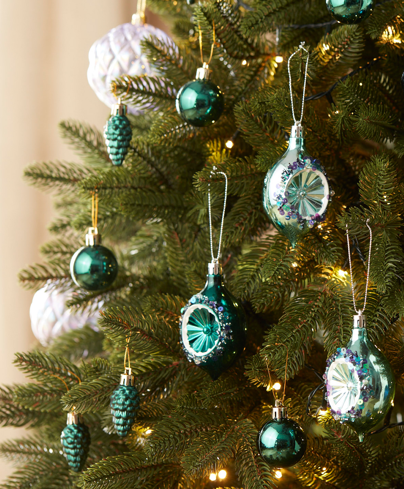 Zawieszki pawie oczka przyciągają uwagę niezwykłym kształtem i starannym zdobieniem. Błyszczące elementy w centrum otoczone dekoracyjnym wykończeniem tworzą efekt biżuteryjnej ozdoby, która pięknie prezentuje się wśród świątecznych światełek. To elegancki detal, który dodaje choince eleganckiego charakteru.